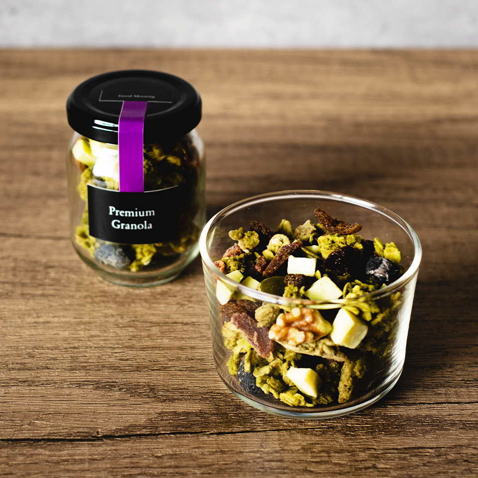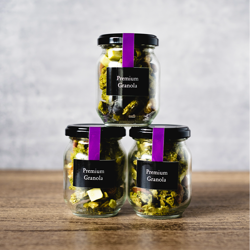 原材料:オートミール、ナッツ(くるみ、アーモンド、かぼちゃの種)、ドライフルーツ(クランベリー・レーズン・いちご)、全粒粉、きび砂糖、メープルシロップ、菜種油、黒豆甘納豆、ホワイトチョコ、抹茶